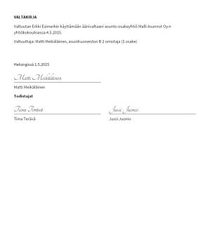 Lataa ilmainen valtakirja pohja asunto-osakkeen myyntiin. Selvitä, tarvitseeko valtakirja todistajia ja varmista asiakirjojesi oikeellisuus helposti ja nopeasti sivuiltamme.